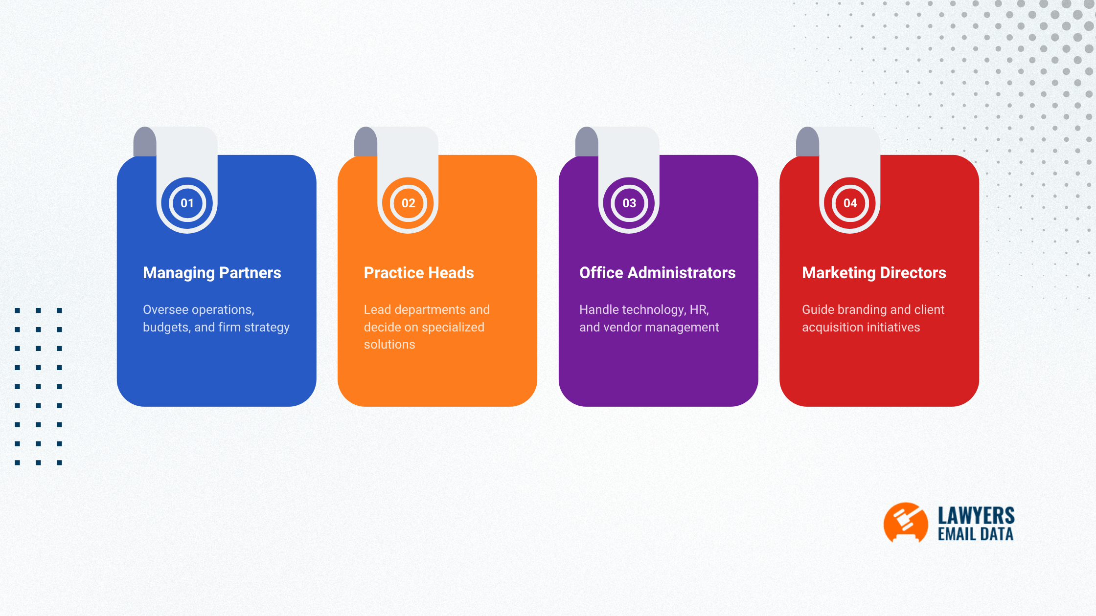 The most influential roles in a law firm include managing partners, practice heads, and firm administrators. These professionals evaluate and approve new tools, services, and partnerships. Targeting them ensures your outreach reaches those with real decision-making power.
